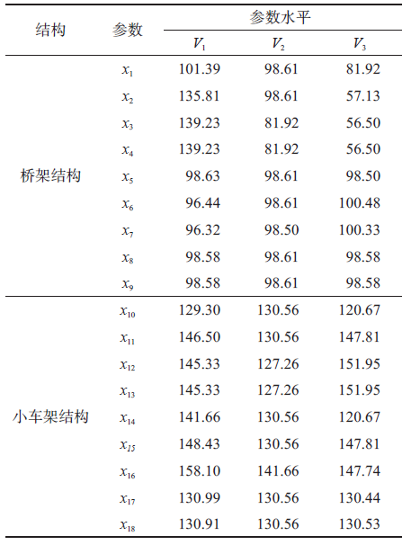 不同參數(shù)水平下起重機(jī)金屬結(jié)構(gòu)的最大應(yīng)力(MPa)